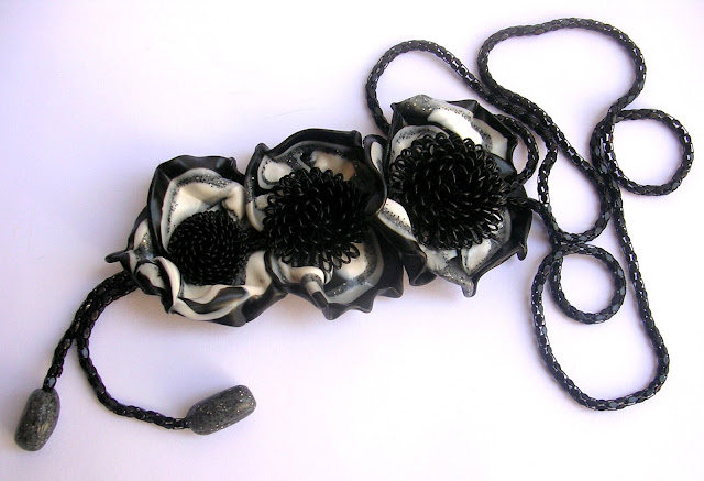 Vila Raviojla Lakirana koža, cipele br. 39 Baja Shoes Ogrlica , prsten i ukrasi na cipelama su rađeni tehnikom milefiori od polimerske gline, uz dodatak staklenih perla i metala. |